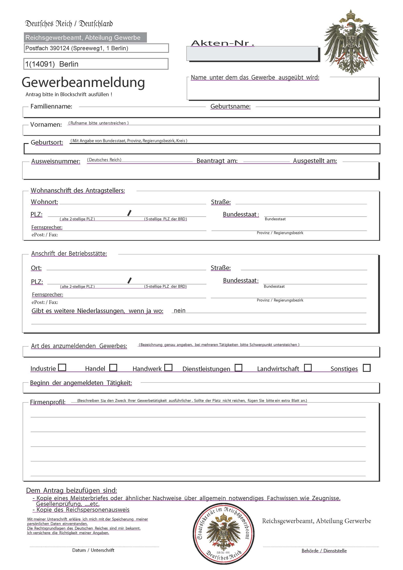 Reichs-Gewerbeanmeldung Von GewerbeamtJuli 1, 2023September 11, 2025Behörde, Reichsgewerbe, Vorschriften Hier können Sie den Reichsgewerbeantrag als pdf erhalten oder über die Reichsdruckerei